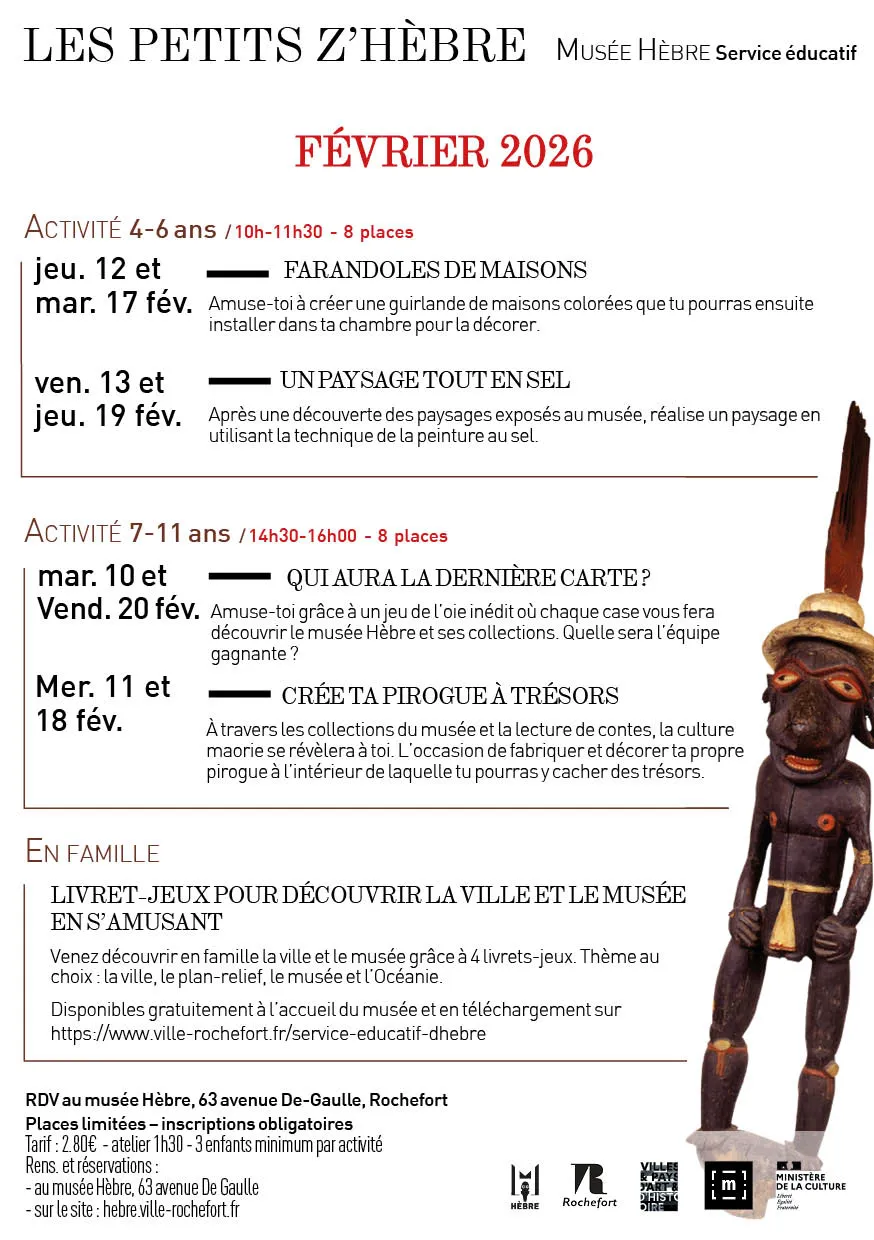 Activités ludiques et de pratique artistique pour les enfants de 4 à 12 ans. Ces ateliers permettent au jeune public de découvrir les collections du musée, la maison de Pierre Loti ou du patrimoine rochefortais.